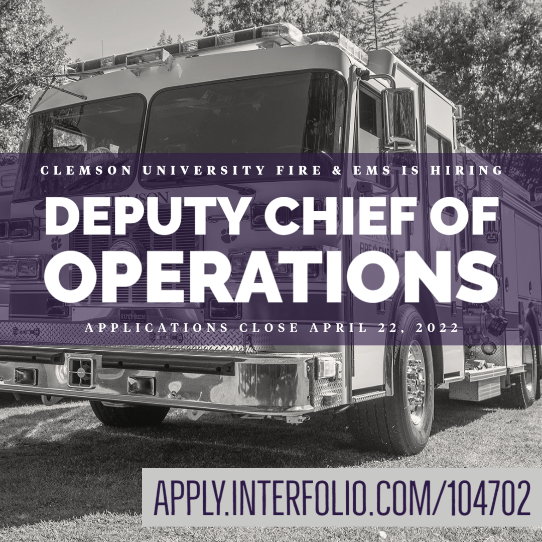 Clemson University Fire & EMS is accepting applications for Deputy Chief of Operations. Applications close on April 22, 2022. Apply online at https://apply.interfolio.com/104702