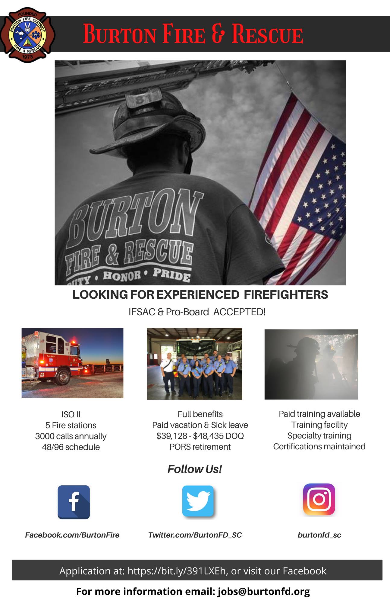 The Burton Fire District is hiring experienced firefighters. IFSAC and Pro-Board accepted. Burton is an ISO II, Advanced EMS provider, operating out of five fire stations and protects over 80 square miles of northern Beaufort County. $39,128 - $48,435 DOQ, full benefits, paid vacation and sick leave. Application can be found at https://bit.ly/391LXEh. Email [email protected] for more information or questions.