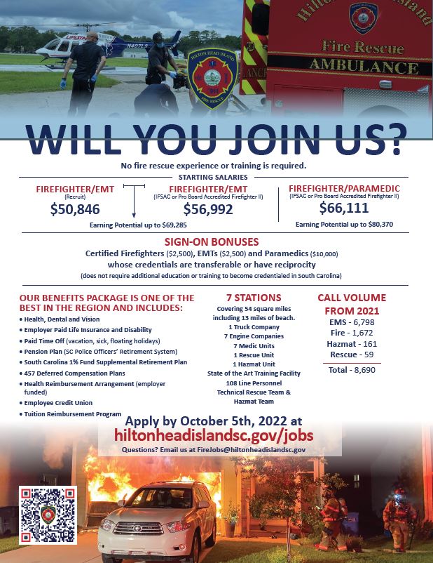 Firefighter/EMT/Paramedic Hours/Day:24 HRS ON / 48 HRS OFF Start Time:8:00AM End Time:7:59AM Closing date:Oct 5, 2022 Firefighter/EMTs and Firefighter/Paramedics perform a wide variety of firefighting, emergency response, public education, and related duties. The department responds to approximately 8500 incidents a year, with approximately 6800 being EMS related responses. Operating out of 7 fire stations in a 24 on and 48 hours off three shift system, Hilton Head Island Fire Rescue is dedicated to serving the community with outstanding customer service and timely emergency response services. Minimum qualifications: High School Diploma or GED; and Must be 18 years of age at time of hire; and Must be in good physical health as determined by a medical examination; and Valid Driver's License. Additional qualifications that may be obtained after hire (not required at time of hire): Valid Class E Driver’s License within one (1) year of hire; and SC Emergency Medical Technician Basic Level Certification and National Registry of EMT's Emergency Medical Technician-B card; and IFSAC or Proboard Firefighter I & II and Haz Mat Operations Certifications. For a full job description, please click here. Salary Range - Firefighter/EMT $50,846- $69,285. Firefighter/Paramedic $66,111- $80,370 with current National Paramedic Registry Certification. Sign-on bonuses will be paid to certified Firefighters ($2500), EMTs ($2500) and Paramedics ($10,000) whose credentials are transferable or have reciprocity (do not require additional education or training to become credentialed in South Carolina). Benefits include health, dental, vision and life insurance, short and long term disability, vacation and sick leave, tuition reimbursement, a healthcare reimbursement arrangement and membership in the SC Police Officers Retirement System. Important Dates: Sept 11 - Oct 5 Firefighter Application Available for Completion Sat. Oct 1 Entry-level Firefighter Exam - Written Format - Location: Town Hall, Hilton Head Island Sept 19 - Oct 8 Entry-level Firefighter Exam - Online Format By Oct 12 Notification to Candidate of Exam Results Nov 5 - 6, 2022 Firefighter Candidate Physical Abilities Assessment (FPCAA) - Location: Fire Rescue Training Center, Hilton Head Island Nov 5 - 6, 2022 Candidate Interview will be conducted on the same day as the FCPAA Nov 7, 2022 New Firefighter Candidate Pool