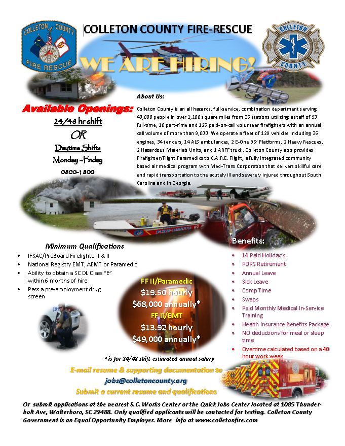 Colleton County Fire-Rescue is hiring! Join our Team! Firefighter/Paramedic - $68,000 annually Firefighter/EMT - $49,000 annually We have changed our hiring process. No waiting on test dates, and we have a new fast track orientation to get you on the street quicker! Email resume to [email protected] Benefits: 14 Paid Holiday’s PORS Retirement Annual Leave, Sick Leave, Comp Time, Swaps Paid Monthly Medical In-Service Training Health Insurance Benefits Package NO deductions for meal or sleep time OVERTIME CALCULATED ON A 40 HOUR WORK WEEK!!!! Minimum Qualifications IFSAC/ProBoard Firefighter I & II National Registry EMT, AEMT or Paramedic Ability to obtain a SC DL Class “E” within 6 months of hire Pass a pre-employment drug screen