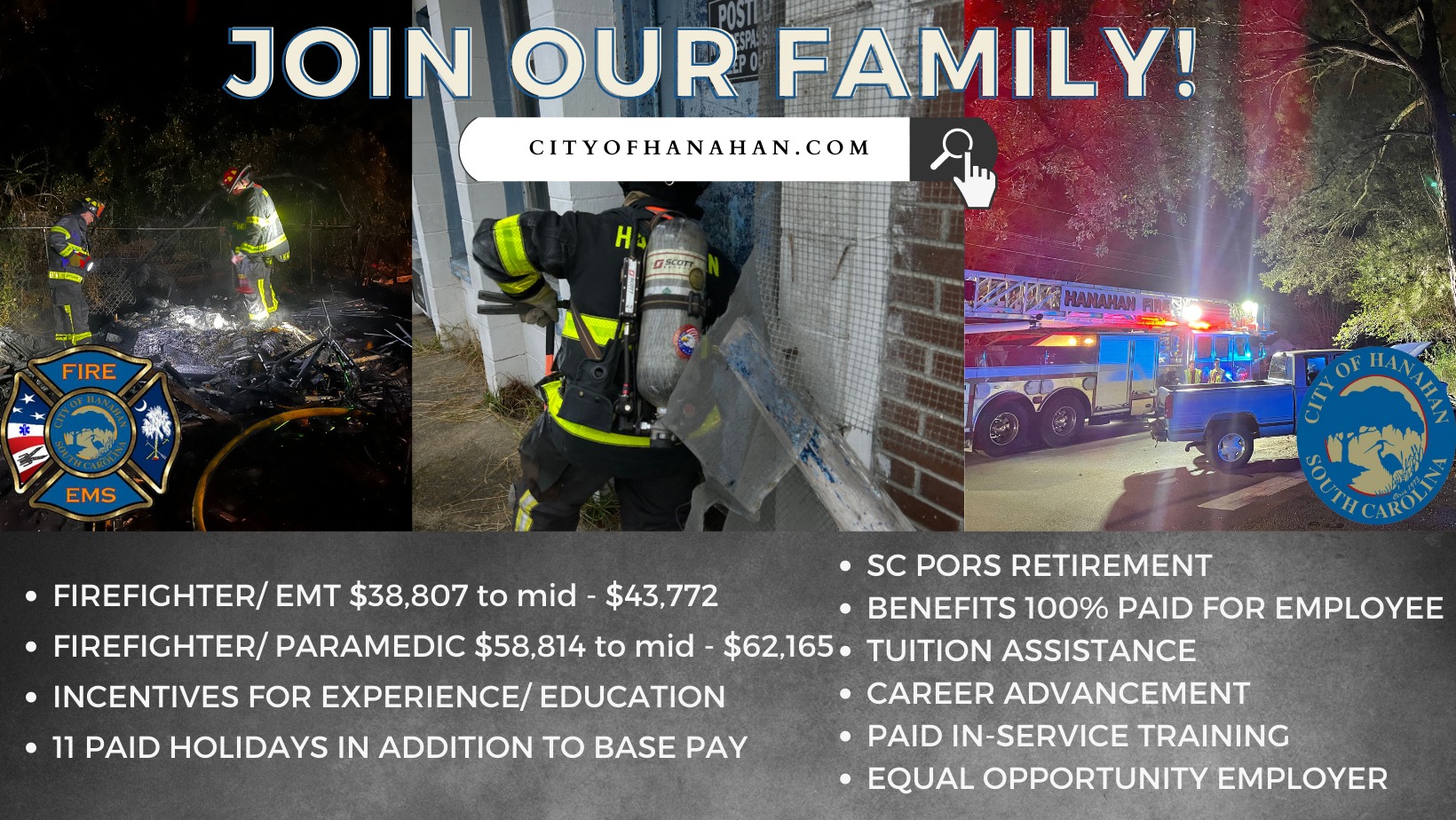 Paramedic/Firefighter (Full-Time) Summary: The City of Hanahan Fire Department is accepting applications for Full-Time Paramedic/Firefighters. Paramedic Position: Responds to fires, medical emergencies, and other emergency situations to administer life support care to sick and injured persons and to protect life and property by performing the following essential duties and responsibilities: Responds to calls for medical aid, including fires, traffic collisions, and rescue situations to provide pre-hospital care, assesses nature and extent of illness or injury to establish and prioritize medical procedures to be followed, or need for additional assistance, observes, records, and reports to physician patient’s condition and reaction to drugs, treatments, and significant incidents, along with other duties as assigned. Paramedic Requirements include: NREMT-P Fundamentals of Firefighting (1152) (Firefighter I and II preferred) SC Driver’s License (Class E preferred); and High school diploma or general education degree (GED) Position requires working 24-hour shifts including evenings, weekends and holidays Benefits: Comprehensive benefit package including SC State retirement, disability, and 100% employee health/dental paid by employer and employer shared dependent coverage with a starting salary range of $54,904.63 to $63,329.09 DOQ (Annualized). Best benefit of all is the ability to work in an environment that believes in “Teamwork” and is family oriented. To Apply: Submit your Resume and City Employment Application by email to Kristine Amara. In person submittals: City of Hanahan – Attn: Human Resources 1255 Yeamans Hall Road Hanahan, SC 29410 The City of Hanahan is an Equal Opportunity Employer.