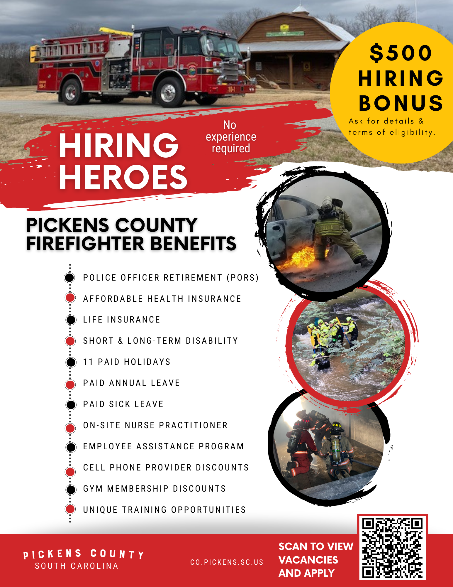 The Pickens County Fire service is "Hiring Heroes". New employees will be joining our team during innovative and progressive times as we continue to develop the Pickens County Fire Service. No experience necessary. Employees receive specialized firefighter, medical, and special operations training. Multiple locations available. All levels of experience and training are welcome to apply. Salary depends on qualifications.