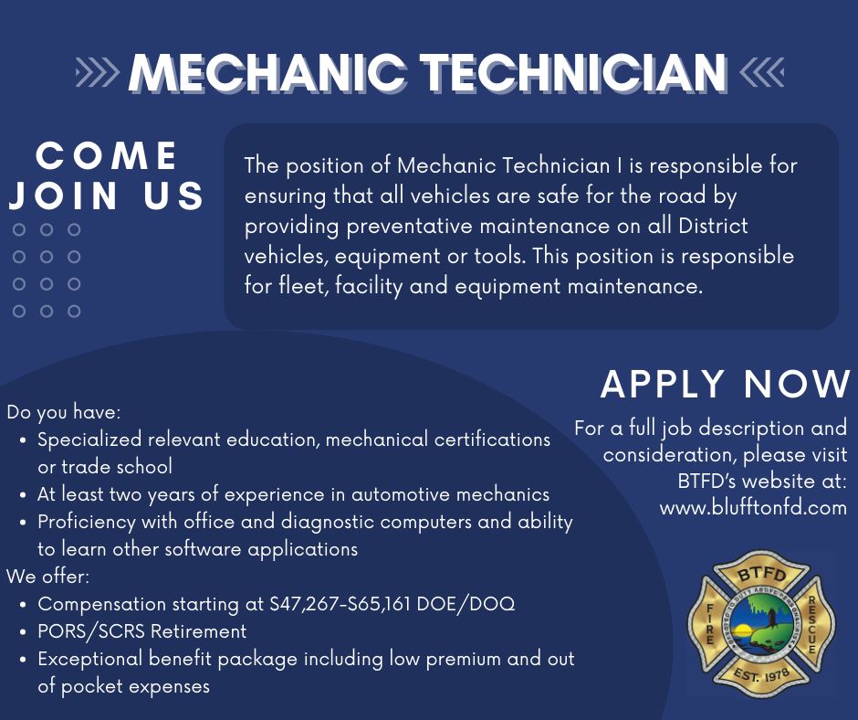 Title: Mechanic Technician I Location: Bluffton, SC Department: Maintenance Salary Range: Starting at $47,267 - $65,161 DOQ/DOE Date Posted: 01/17/2023 Application Deadline: Open until filled. Position Summary The position of Mechanic Technician I is responsible to ensure all vehicles are safe for the road by providing preventative maintenance on all District vehicles, equipment or tools. This position is responsible for fleet, facility and equipment maintenance.