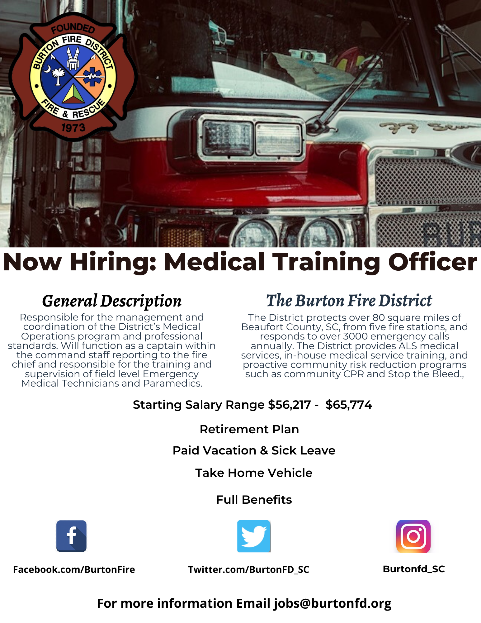 Burton Fire District is looking for a Staff/Captain Medical Training Officer, responsible for the management and coordination of the District’s Medical Operations program and professional standards. Will function as a captain within the command staff reporting to the fire chief and supervising field level Emergency Medical Technicians and Paramedics. REQUIREMENTS: • Must be a NREMT Certified/South Carolina licensed Paramedic. • Must have at least three years of Paramedic level field experience. • Must have and maintain ACLS and CPR certifications. • Must have or be eligible for CEP and CPR instructor credentials. • Must have thorough knowledge and mastery of the adopted emergency medical protocols for Burton providers and have a thorough knowledge of modern emergency medical principles and practices. • Must be certified and maintain Infection Control Officer in accordance with NFPA 1581 Standard on Fire Department Infection Control Program. • Must pass annually the physical examination by the BMH Occ Health Physician and maintain their respirator qualification. • Must be able to successfully pass drug screen when selected.