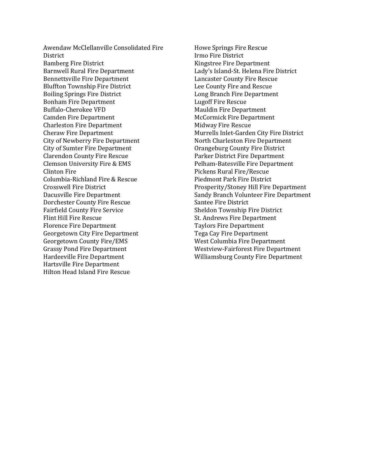 “Outreach has been tremendous,” State Fire’s CRR Chief Josh Fulbright said. “Departments reported more than 1,500 CRR events, educating more than 250,000 citizens. We congratulate designees, to whom alarm resources are available, and are providing each a custom Fire Safe SC Community sign denoting their success.” Fire Safe SC’s organizational partners include the S.C. State Firefighters’ Association, the S.C. State Association of Fire Chiefs, and the S.C. Fire Marshal Association. Together, they announce the following fire departments have been actively engaged and completed various goals for designation as a Fire Safe SC Community.