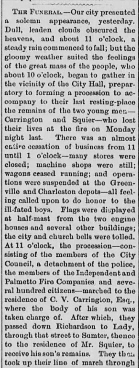 “This is the first accident of a serious nature which has ever occurred at a fire in Columbia, and it behooves those in authority to inquire minutely into the matter, and cause a general inspection of walls – as is the case in other cities – so that firemen may be warned of danger, and not be compelled to run the risk of losing their lives in their gratuitous endeavors to save the property of their fellow-citizens.”
