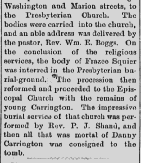 In a show of support, all classes of citizens gathered to “march” from City Hall, forming a procession, to the home of Mr. Carrington “where the body of his son was taken charge of.” The crowd continued its mission. Hundreds solemnly walked in cold, rainy weather through the downtown streets of Columbia to the Squier residence “to receive his son’s remains.” Everyone then walked to First Presbyterian Church for the dual service. Afterwards, a burial for Squier took place as he was “interred in the Presbyterian burial ground.” The procession then reformed. They walked less than half a mile to Trinity Episcopal Cathedral with the remains of young Carrington. Afterwards, “all that was mortal of Danny Carrington was consigned to the tomb.”