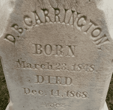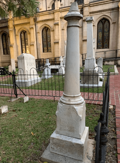 Trinity Episcopal Cathedral’s graveyard is located at 1100 Sumter Street across from the SC State House in Columbia. As you enter the front gates, turn left. The Carrington family plot is surrounded by a small wrought iron fence.
