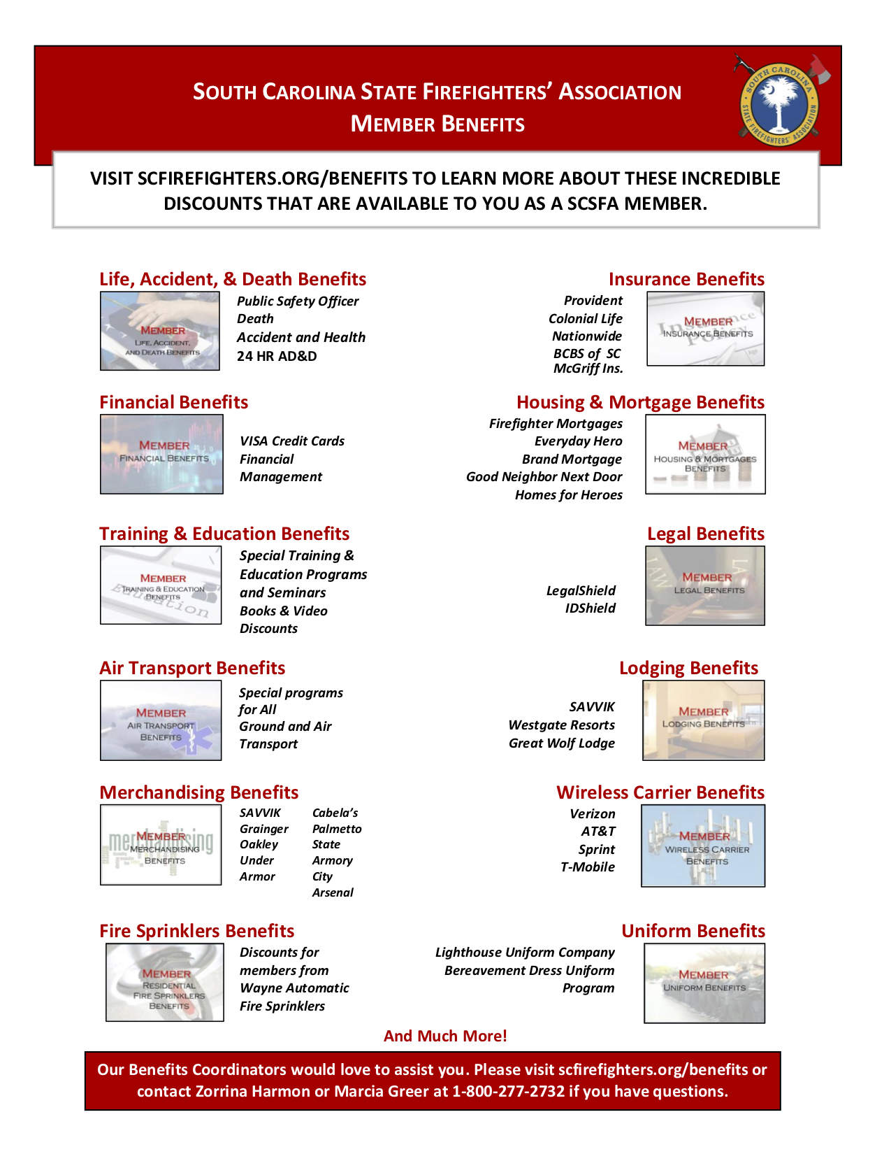 If you have any questions regarding any of these great benefits please visit our website at www.scfirefighters.org or call the Association office at 800-277-2732.