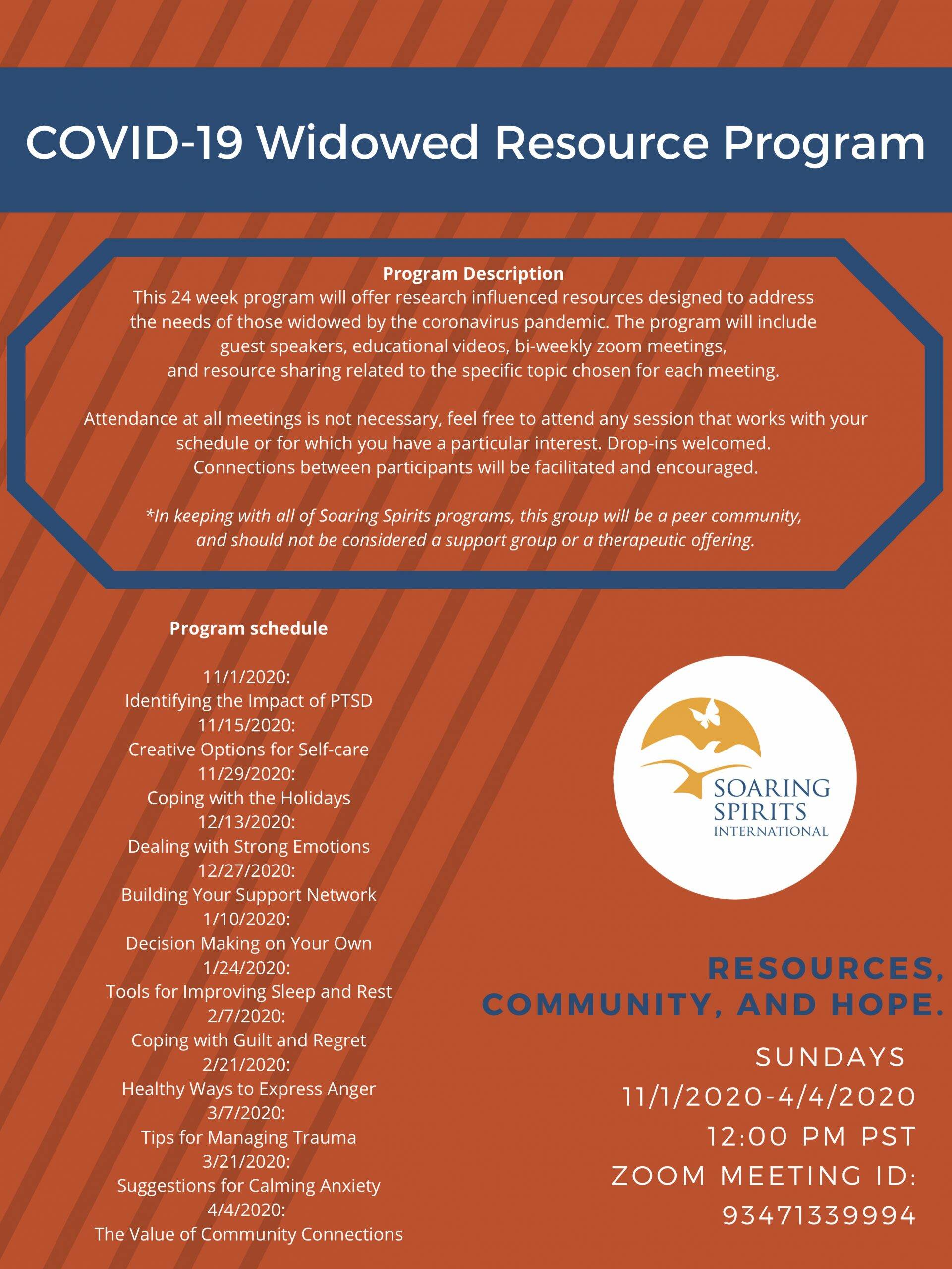 Soaring Spirits’ mission is to provide programs, resources and a community of support for widowed people. Though this global health crisis has altered some of our program offerings, this disease won’t stop us from offering you vital access to comfort, support and understanding from people who have also experienced the death of their person, and find themselves trying to pick up the pieces of the life they used to live. Soaring Spirits will provide you with some direct links to the support they offer for the newly widowed, as well as downloadable documents to help you walk through the days ahead. These resources were developed specifically for widowed people, by widowed people to be helpful in the days ahead.