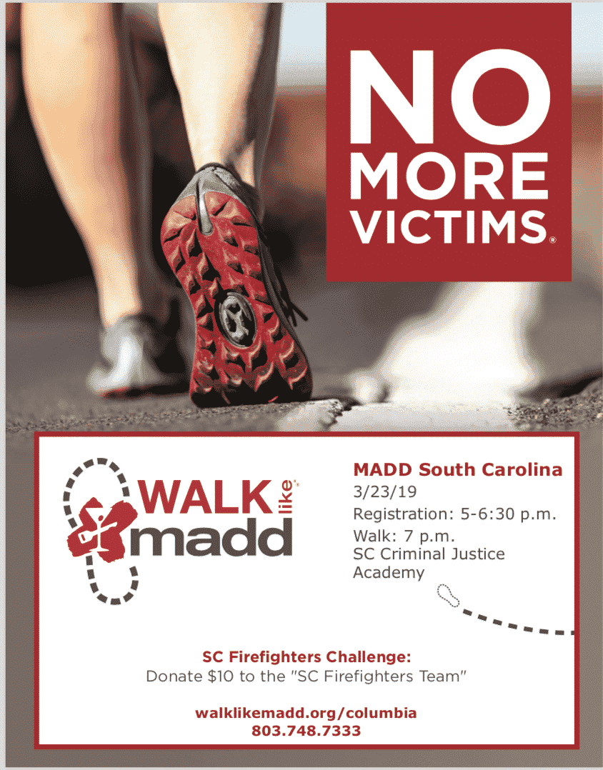 Please take a minute to review the information on the Walk Like MADD event and put 3/23/19 in your planner as a ‘must attend’. If you are unable to attend and would like to contribute even a few dollars for the walk event contact [email protected] or (803) 800-7486 if you have any questions. I’ll see you there.